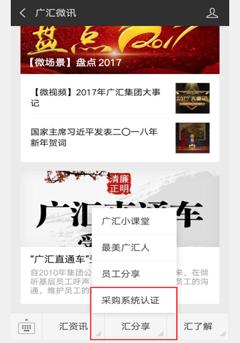 (第一步)打开微信扫一扫功能,扫描"广汇微讯"二维码: (第二步)扫描二维码后,点"关注公众号"(如下图): (第三步)关注公众号后,点“汇分享 - 采购系统认证”(如下图): (第四步)在“采购系统认证”页,输入您在广汇电子采购平台的用户名、密码,点"认证"(如下图)。 (第五步)认证成功后,可以在广汇电子采购平台进行正常的业务操作 谢谢您的合作,祝您工作愉快!